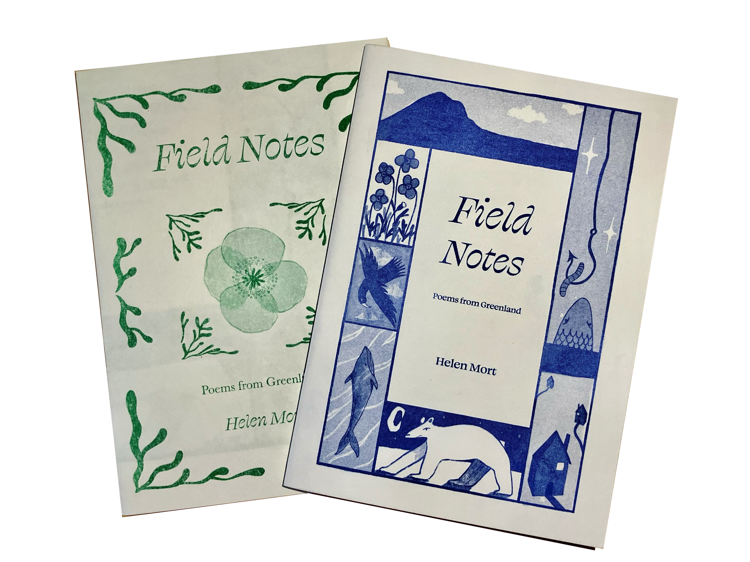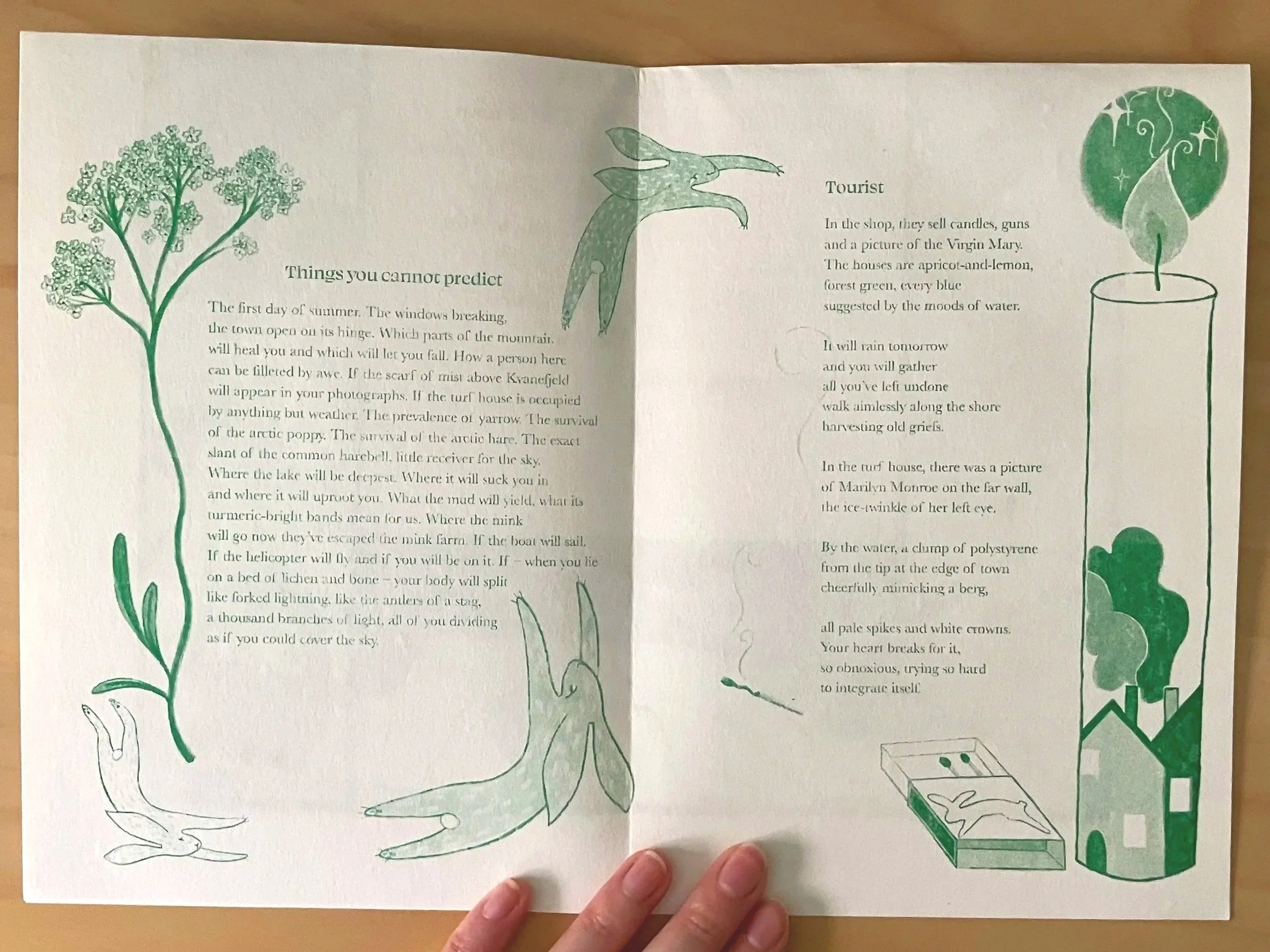Brief: To create and design several illustrated broadsides for exhibition featuring poems by Helen Mort, as well illustrating and designing a zine containing a collection of her poems for dissemination at the event. The poems reflected on Helen’s time in Greenland on an artists residency, and the overall theme of the exhibition was centred around the effects of a changing climate on Greenlands landscapes.